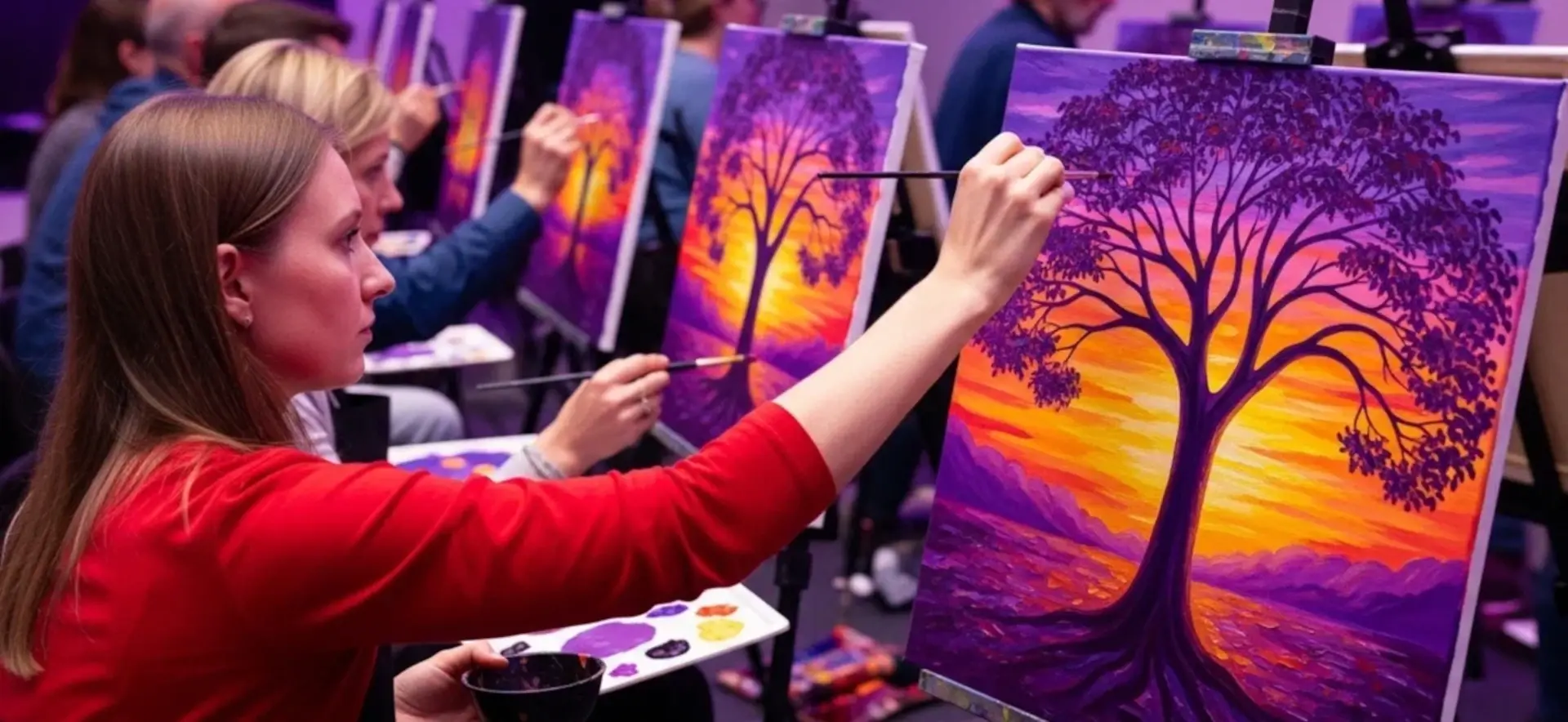 Мастер-класс по рисованию акрилом можно провести где угодно: в офисе, в ресторане, на выездной площадке. Мы все устроим и организуем рабочее пространство, чтобы участникам было удобно и приятно творить.