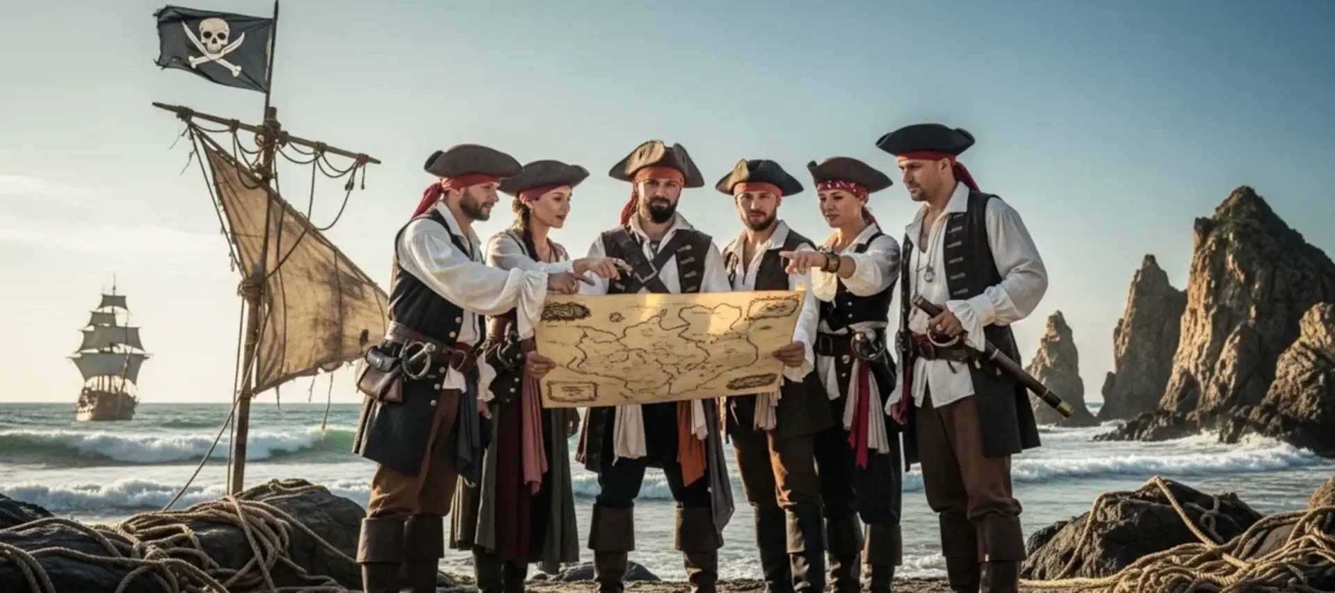 Детский пиратский тимбилдинг строится по схожей логике, но с акцентом на сказочность, яркие образы и безопасные активности: поиск карты сокровищ, пиратский квиз, морские узлы, сигнальный код и финальное открытие сундука с призами.