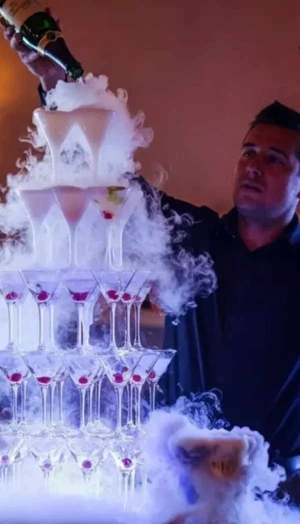 Официанты выстраивают многоуровневую пирамиду из бокалов для шампанского и одновременно наполняют верхние ярусы игристым – напиток красивым каскадом переливается сверху вниз, наполняя десятки бокалов. Гости получают не только бокал шампанского, но и яркое зрелище.